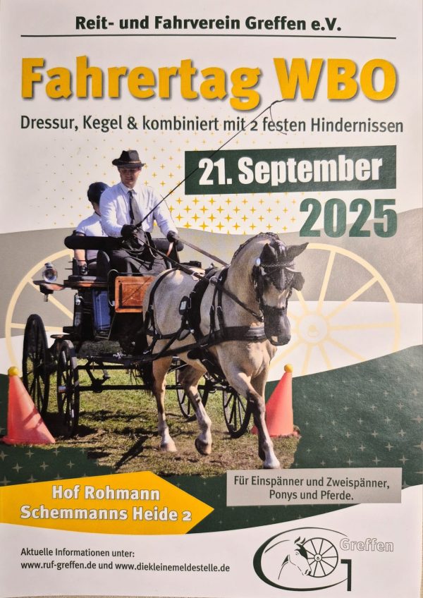 Am Sonntag, den 22.09.2024 fand unser WBO – Fahrertag auf unserem Vereinsgelände am Hof Rohmann in Greffen statt. Bei insgesamt 12 Prüfungen hatten die Teilnehmer die Möglichkeit Ihr Können unter Beweis zu stellen. Für die Dressurprüfungen stand ein Dressurviereck zur… Weiterlesen →